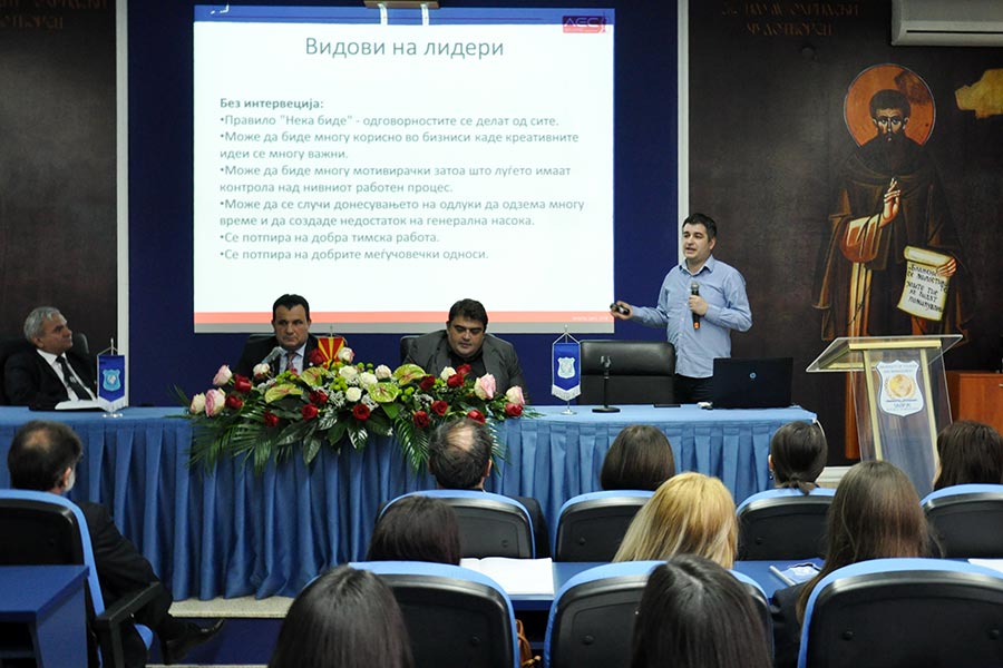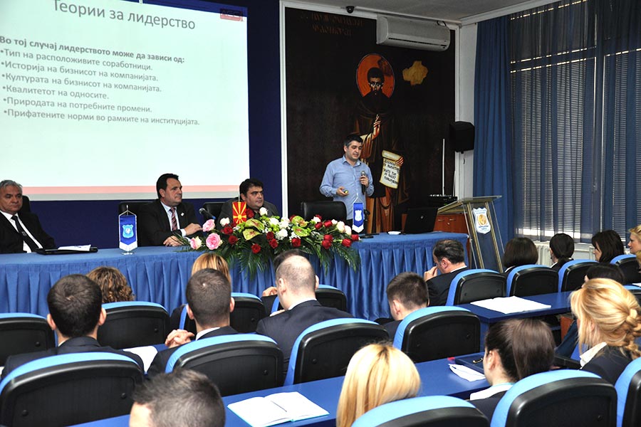Visiting lecturers have presented themselves first Vice Rector for Teaching at the University of Tourism and Management, Mijalce Georgievski PhD, and Vice Rector for International Cooperation Zoran Ivanovski PhD. Followed the adviser of market analysis Vladimir Ristovski started his lecture with a previous and well outlined presentation of the topic. In his address to the students first defined the term leadership, or what it means and what kind of leadership and leaders there, but at the same time explaining the factors that influence the style of leadership . According to him a successful leader is one who has the ability to give directions to the others, but even more is the one that has the ability to persuade people to take action. While not excluding the fact that there are leaders who simply have an innatiate charisma to it, however, by Ristovski, leader is not born, but is created through learned theory and practice through the respective years. For this claim he pointed a few examples of people who now apply for leaders and successful managers in the world.