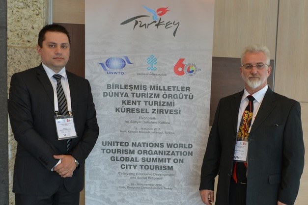 United Nations World Tourism Organization (UNWTO) and the Ministry of Culture and Tourism of Turkey were organizers of the global summit on city tourism development, which took place from 14.11. to 16.11.2012 in Istanbul. At the same time there was a 33rd plenary session of the associated members of the UNWTO. The delegation from the University of Tourism and Management - Skopje, as supporting members, led by the Chancellor, Prof.Ace Milenkovski, PhD and the Dean of the Faculty of Tourism Assoc. Prof. Sashko Gramatnikovski, PhD, attended these gatherings of the global leaders in the field of tourism. Although UTMS is a recent member of the UNWTO, it has already become acknowledged and active participant in the planning and realization of projects for the future development of tourism in general and some of its new segments. Such a given confidence is not accidental, namely, it is due to the presence and active participation at the meetings arranged by UNWTO, as well due to personal, formal and informal contacts and discussions on several occasions, with prominent persons of the UNWTO, which were no longer strictly professional, but on a friendly basis, to be precise. These relations are of great importance for Macedonia, since the people of the world tourism have a partner in Macedonia, a single partner within our borders so far - UTMS, which has been involved in projects for the development of global tourism, but also for the efficient development of tourism in Macedonia.