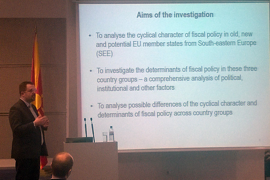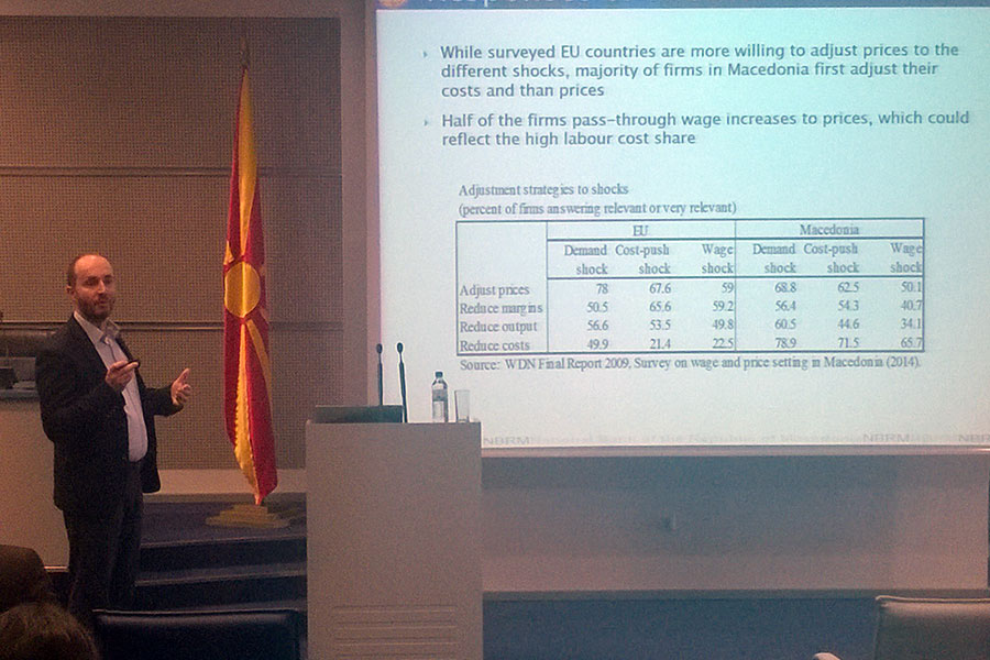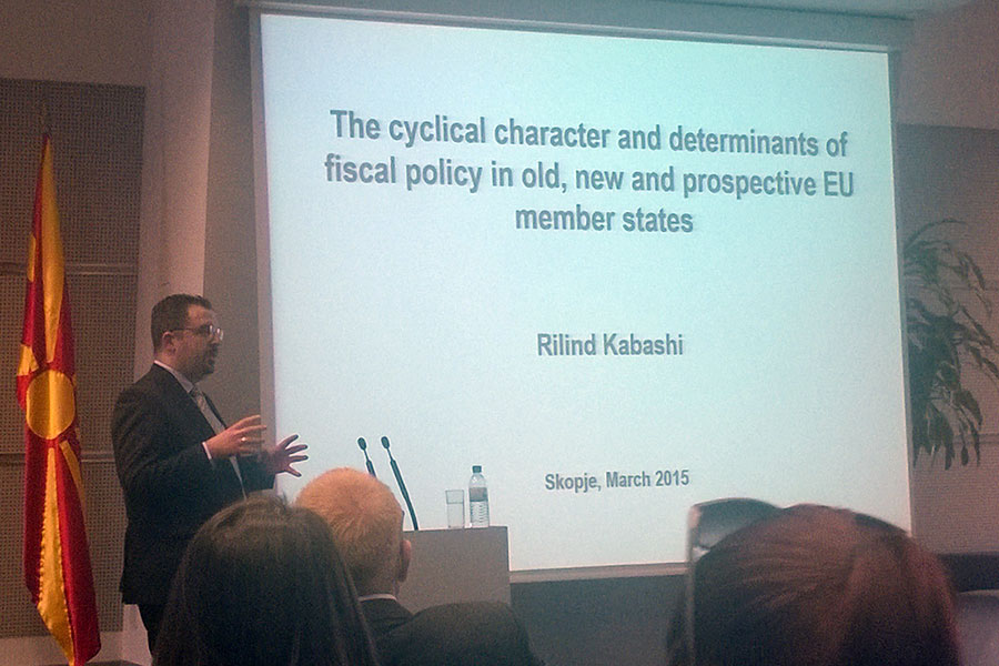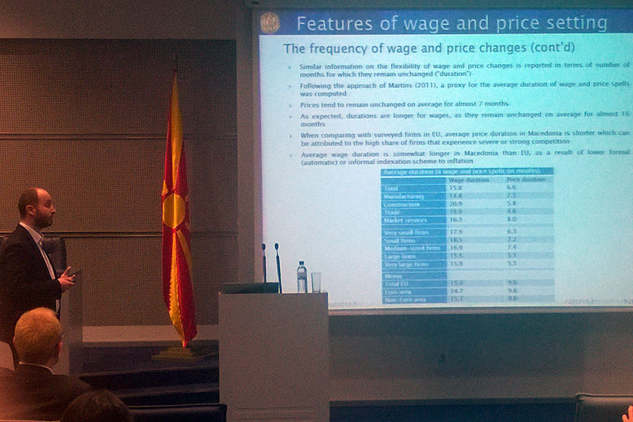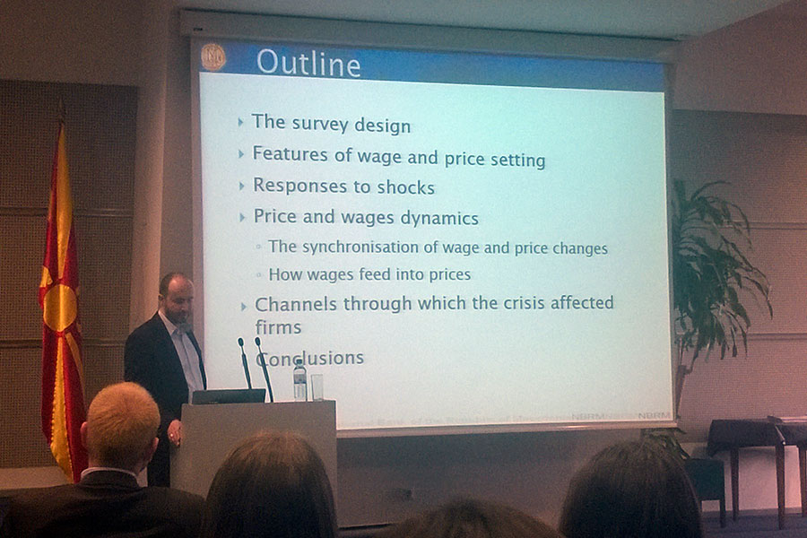Презентирањето на трудовите го започна господинот Гани Рамадани кој посочи дека неговиот труд со наслов: „Wage and Price Settings in Macedonia: Evidence from Survey Data" претставува истражување за врската помеѓу платите и цените во Република Македонија и како кризата влијаела врз активностите на фирмите. Притоа тој наведе дека главната цел на неговиот труд е насочена кон идентификување на релевантни каракеристики за платите и цените во Република Македонија, врската помеѓу нив и што би се случило доколку се појават непланирани токови во економијата. По неговото завршување, со презентирање настапи господинот Рилинд Кабаши, кој посочи дека неговиот труд со наслов "The Cyclical Character and Determinants of Fiscal Policy in Old, New and Prospective EU Member States" има три цели и тоа: да се анализира емпириски цикличниот карактер на фискалната политика во старите, новите и потенцијалните земји членки на ЕУ, да се истражат дополнителни детерминанти во цикличната економија и да се најдат разликите во детерминантите во цикличната економија.