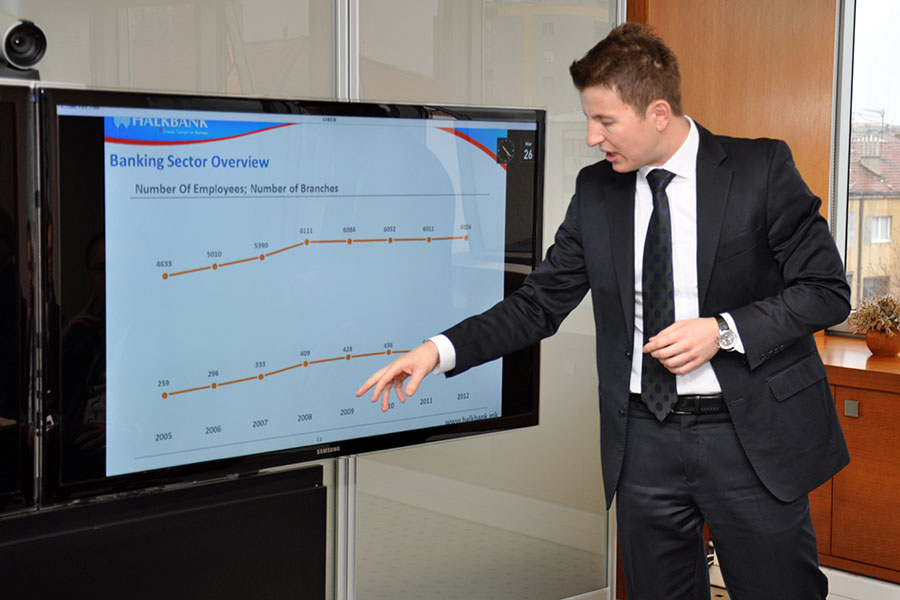 Во присуство и со активно учество на директорот, Господин Турхан Адеми, инаку член на Советодавниот одбор на Економскиот факултет на УТМС, своја презентација пред студентите на Универзитетот за туризам и менаџмент, имаше м-р Атила Селим, раководител на продажба на Халк Банката. Тој во своето исцрпно и сеопфатно излагање, на студентите на УТМС, со исклучително софистициран и дедуктивен пристап, им ја презентираше екстраполацијата на монетарните движења во Република Македонија, за потоа истата да ја инкорпорира низ системот на функционирањето на Халк банката, истовремено прикажувајќи го водењето на банкарскиот сектор во државата, од основањето, преку аквизицијата на Зираат банкаси, па се до перспективите и концепциите во идниот период.
