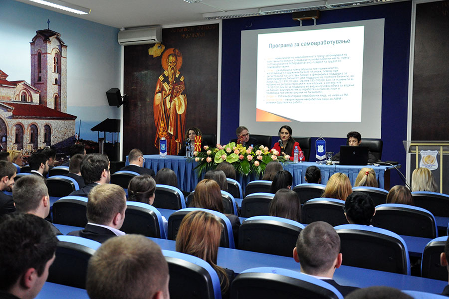 Во рамките на реализацијата на Програмата на запознавање, приближување, надградување и практично искористување на досегашните и новите функционални можности кои стојат пред младите, исцрпно и целесообразно презентирање пред студентите на Универзитетот за туризам и менаџмент од Скопје, одржа директорката на Агенцијата за вработување на Република Македонија-Скопје, м-р Слободанка Алексовска.